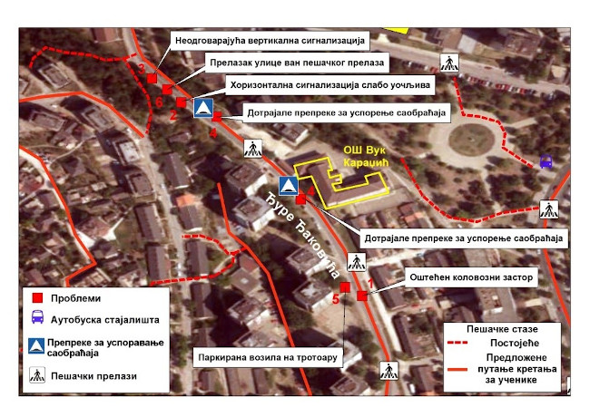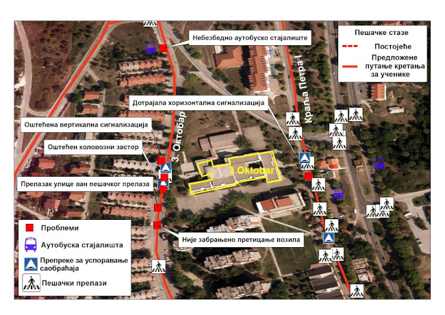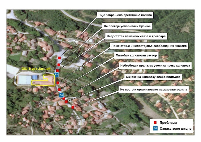11. Problem je jako veliki u selima u kojima se objekti osnovnih škola nalaze uglavnom uz državne puteve koji prolaze kroz naseljena mesta. U većini seoskih naselja ne postoje trotoari, dok u nekim selima postoje trotoari koji su redovno zauzeti vozilima čime je onemogućeno kretanje pešaka celom dužinom trotoara (što je slučaj i na pojedinim lokacijama u gradu).