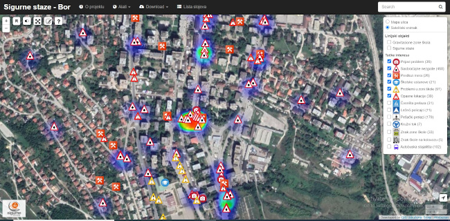 Primer upotrebe GIS-a možete videti u projektu urbane mobilnosti GIS udruženja Srbije “Sigurne staze i putanje kretanja učenika osnovnih i sredenjih škola u Boru” koji podržan od Programa Ujedinjenih nacija za ravoj i Kancelarije za informacione tehnologije i elektronsku upravu. Projekat je dostupan na linku.