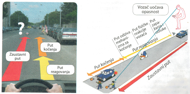 Put reagovanja je put koji vozilo pređe od momenta kada uočimo opasnost ispred vozila, do momenta stavljanja noge na papučicu kočnice, kada počinjemo da kočimo. Dužina puta reagovanja zavisi od vremena reagovanja i od brzine kojom se krećemo. Prosečno vreme reagovanja iznosi od 0,8 do 1,2 sek. Uzećemo da je vreme reagovanja 1 sek. što znači da vozilo koje ide brzinom od 50 km/h za jednu sekundu prelazi put od 14 m.