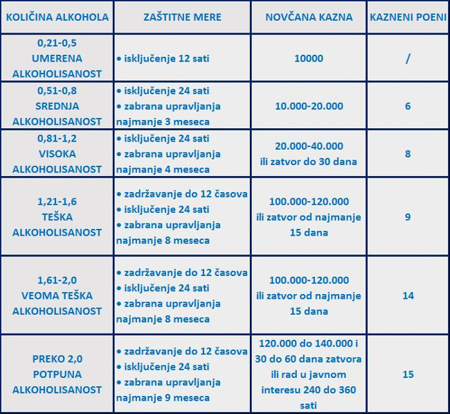Vozač ne sme da u svom organizmu ima alkohol ili psihoaktivne supstance, ali i da pokazuje znakove poremećaja koji su posledica konzumiranja istih. Koncentracija alkohola u krvi zavisi od mnogo činilaca: količine hrane, vrste alkoholnog pića, brzine kojom se alkoholno piće ispija, telesne težine, genetike i tolerancije, stanja jetre, lekova itd.