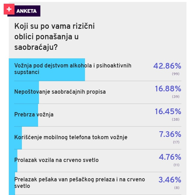 Sada bih želeo da vam predstavim rezulte ankete koju je naše udruženje sprovelo sa portalom mondo.rs. Kao što možete da vidite skoro 43% građana smatra da je najrizičniji oblik ponašanja u saobraćaju vožnja pod dejstvom alkohola i psihoaktivnih supstanci. Dok što se tiče pitanja iz naslova ove kolumne, „Da li treba povećati kazne za vožnju pod dejstvom alkohola?“. Skoro 40% građana je za trajno oduzimanje vozačke dozvole za vozače koji su upravljali vozilom u stanju potpune alkoholisanosti, 31% je da se uvede nulta tolerancija za sve vozače, 14% je za obavezno instaliranje alko-brava za vozače recidiviste, dok 15% smatra da je trenutna kaznena politika dovoljna.