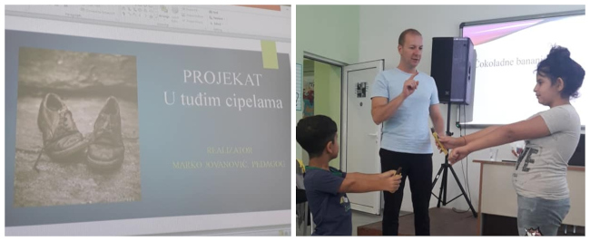 Projekat ,, U tuđim cipelama “ za cilj je imao osnaživanje kapaciteta članova romskih i neromskih porodica i pojedinaca iz užeg okruženja osoba sa invaliditetom kako bi im bili odgovarajuća podrška u prevazilaženju problema sa kojima se susreću radi uspešne inkluzije u društvo. Prvenstveno u obrazovanju a zatim u svim drugim segmentima u zavisnosti od njihovog interesovanja.