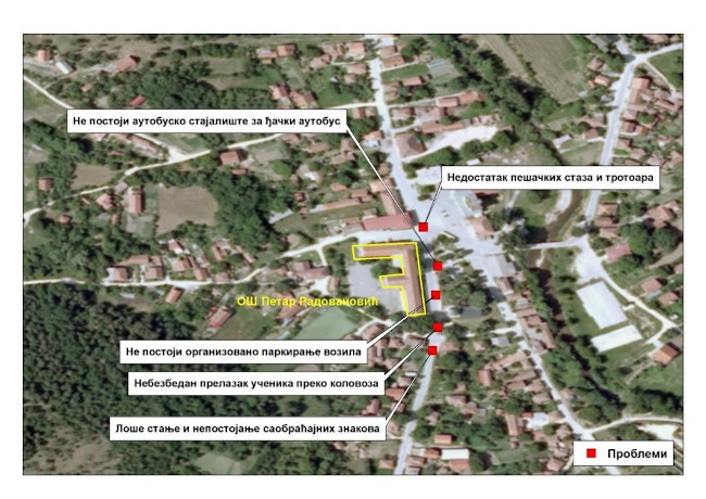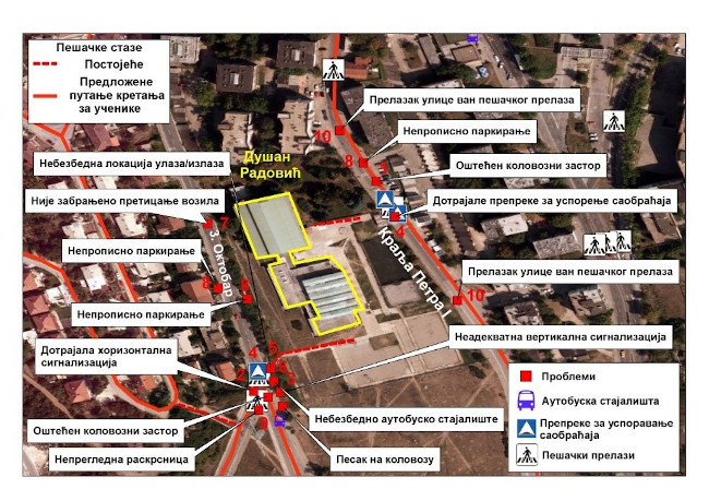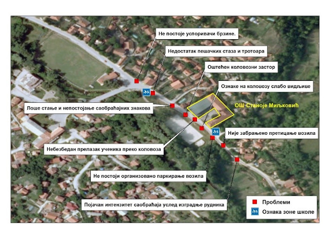 11. Problem je jako veliki u selima u kojima se objekti osnovnih škola nalaze uglavnom uz državne puteve koji prolaze kroz naseljena mesta. U većini seoskih naselja ne postoje trotoari, dok u nekim selima postoje trotoari koji su redovno zauzeti vozilima čime je onemogućeno kretanje pešaka celom dužinom trotoara (što je slučaj i na pojedinim lokacijama u gradu).