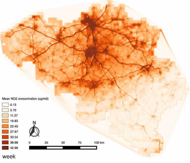 U sličaju uticaja na životnu sredinu saobraćajnica motornih vozila, postoje isto tako brojni modeli i algoritmi za proračun i prikaz njihovog uticaja na zagađenje česticama, gasovima i bukom. Potrebno je samo uzeti poznate srednje vrednost zagađenja za koje znamo da važe za određeno područje, jer poznate su karakteristike svih registrovanih vozila, broj vozila koje se kreću nekom saobraćajnicom u nekoj vremenskoj jedinici, primeniti opet spreman, proveren i besplatno dostupan nam prostorni algoritam i dolazimo do preciznih modela mreže linijskih zagađivača nekog grada npr.