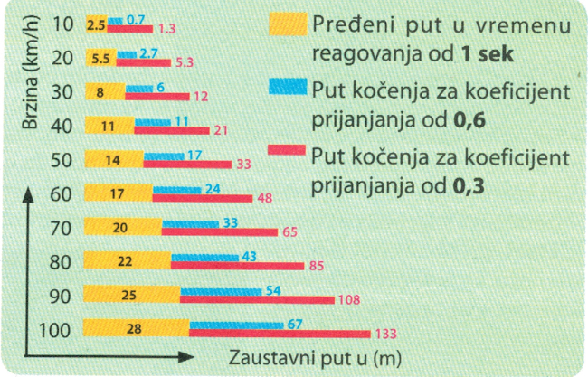 Put kočenja se takođe povećava i sa kvadratom brzine, što znači da će pri dvostruko većoj brzini put kočenja biti 4 puta duži. Pri brzini od 40 km/h put kočenja je 16 m a pri brzini od 80 km/h je 64 m.