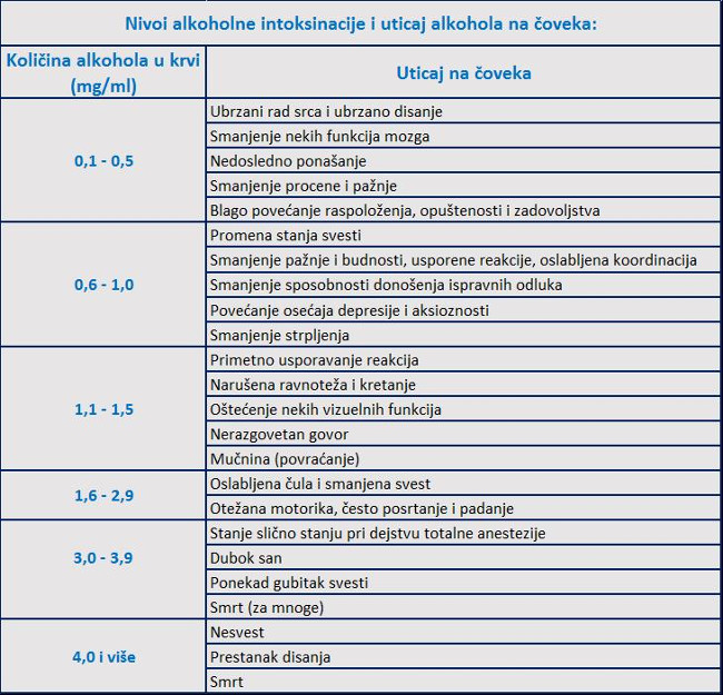 Međunarodna klasifikacija određuje nivoe alkoholne intoksikacije i uticaj alkohola na čoveka (prema Svetskoj zdrastvenoj organizaciji) kao: