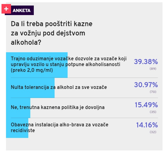 Sada bih želeo da vam predstavim rezulte ankete koju je naše udruženje sprovelo sa portalom mondo.rs. Kao što možete da vidite skoro 43% građana smatra da je najrizičniji oblik ponašanja u saobraćaju vožnja pod dejstvom alkohola i psihoaktivnih supstanci. Dok što se tiče pitanja iz naslova ove kolumne, „Da li treba povećati kazne za vožnju pod dejstvom alkohola?“. Skoro 40% građana je za trajno oduzimanje vozačke dozvole za vozače koji su upravljali vozilom u stanju potpune alkoholisanosti, 31% je da se uvede nulta tolerancija za sve vozače, 14% je za obavezno instaliranje alko-brava za vozače recidiviste, dok 15% smatra da je trenutna kaznena politika dovoljna.