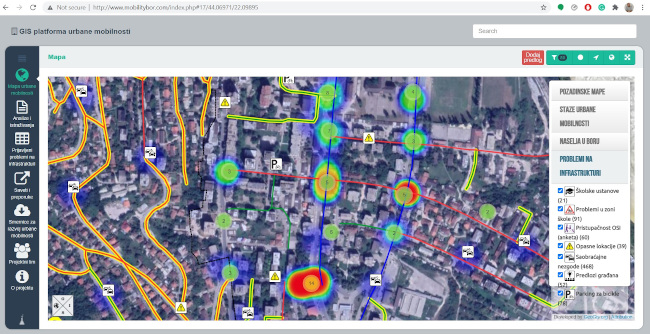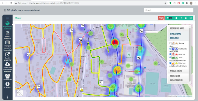 Na interaktivnoj GIS mapi predstavljeni su problemi u zonama škola, opasne lokacije, prostorna raspodela saobraćajnih nezgoda, ocena stanja pristupačnosti saobraćajne i urbanističke infrastrukture za osobe sa invaliditetom kao i predlozi građana za kvalitetnije uređenje javnog prostora.