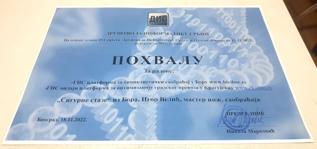 Pohvala je dodeljana za razvoj GIS platforme “Bici Bor (www.bicibor.rs)” za upravljanje biciklističkim saobraćajem na teritoriji grada Bora i za GIS platformu “Eko bus (www.ekobus.rs)” za optimizaciju javnog gradskog prevoza u Kragujevcu.