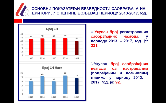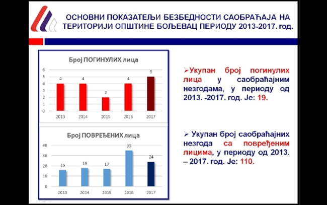 U sklopu predavanja predstavljena je i kratka analiza saobraćajnih nezgoda za Opštinu Boljevac u periodu od 2013 do 2017. god.