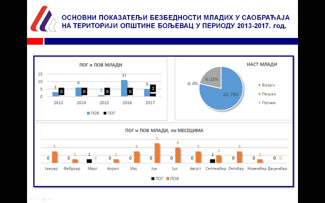 Važno je napomenuti da su u analiziranom periodu život izgubile dve osobe mlađe od trideset godina starosti, što čini 11% ukupno poginulih lica (u Srbiji čine 21% poginulih lica), dok je broj povređenih mladih 26, što čini 24% ukupno povređenih lica (u Srbiji čine 32% povređenih lica). Najviše mladih na teritoriji opštine Boljevac u saobraćajnim nezgodama su stradali u svojstvu vozača (22,79%), istakao je Velić.