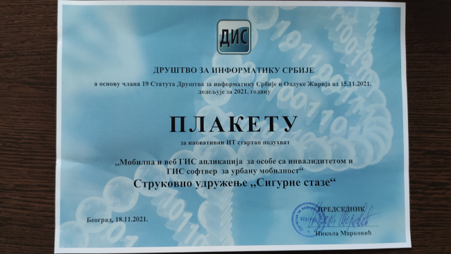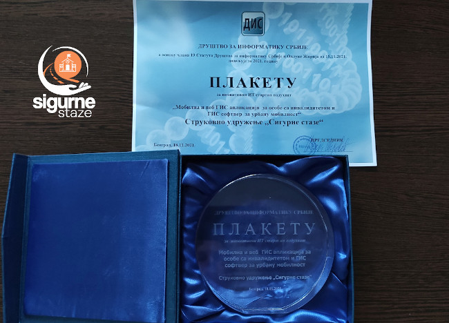 Društvo za informatiku Srbije dodelilo je Plaketu udruženju Sigurne staze za inovativan start up poduhvat i za izvanredne doprinose u razvoju informacionih tehnologija u 2021. godini.