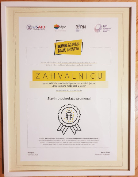 Nagrada je dodeljena za ostvarene rezultate projekta “Staze urbane mobilnosti na teritoriji grada Bora” u sklopu koga je nastao prvi GIS softver za urbanu mobilnost na teritoriji Jugoistočne Evrope “Mobility Bor (mobilitybor.com)”, kao i za unapređenje bezbednosti saobraćaja ranjivih učesnika u saobraćaju (dece, pešaka, biciklista i osoba sa invaliditetom) i promociju koncepta održive urbane mobilnosti na teritoriji grada Bora.
