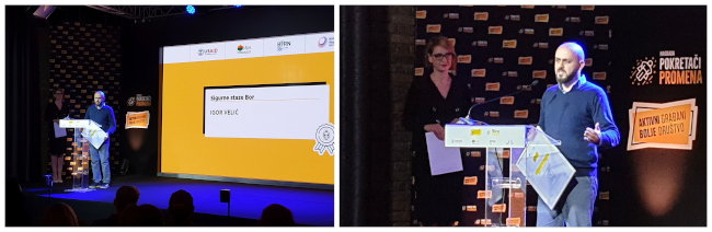 Godišnja nagrada za Pokretače promena koja se dodeljuje se u okviru projekta „Aktivni građani - bolje društvo: zagovaranjem ka saradnji i demokratskom razvoju” pripala je Igoru Veliću, master inž. saobraćaja, predsedniku Udruženja Sigurne Staze iz Bora za upotrebu IKT-a u aktivizmu.